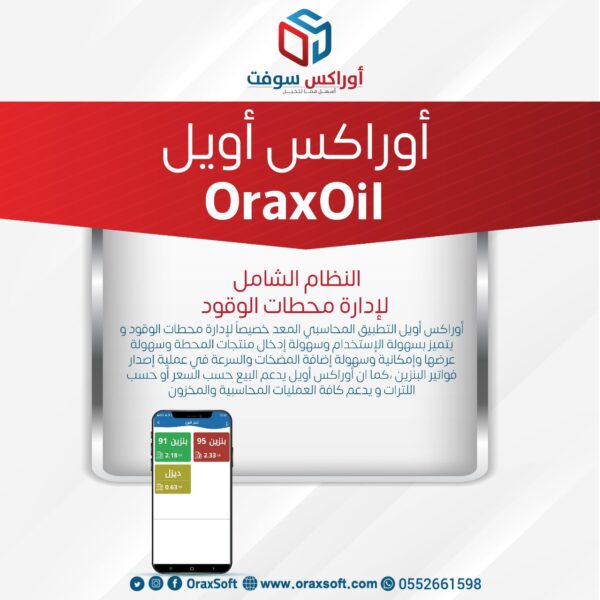 اوراكس اويل برنامج محاسبي شامل مخصص ل اجهزت الاندرويد مقدم من شركة الحلول الذهبيةلتقنية المعلومات . البرنامج صمم خصيص ا لمحطات البنزين .يتميز التطبيق بالسهولة والوضح وهذاتعتبر اهم ميزات البرنامج. ذا يعتبر اوراكس اويل موفر مجموعه من الخدمات والأدوات . أيضا سهولة في إدخال المنتجات وسرعة في اصدار فواتير الشراء وأيضا الميزات العديدة التي تساعد على تحسين عمليات البيع والشراء. تقدم الشركة نسخة تجريبية للبرنامج للعميل أيضا تقوم بتدريب على استخدام التطبيق